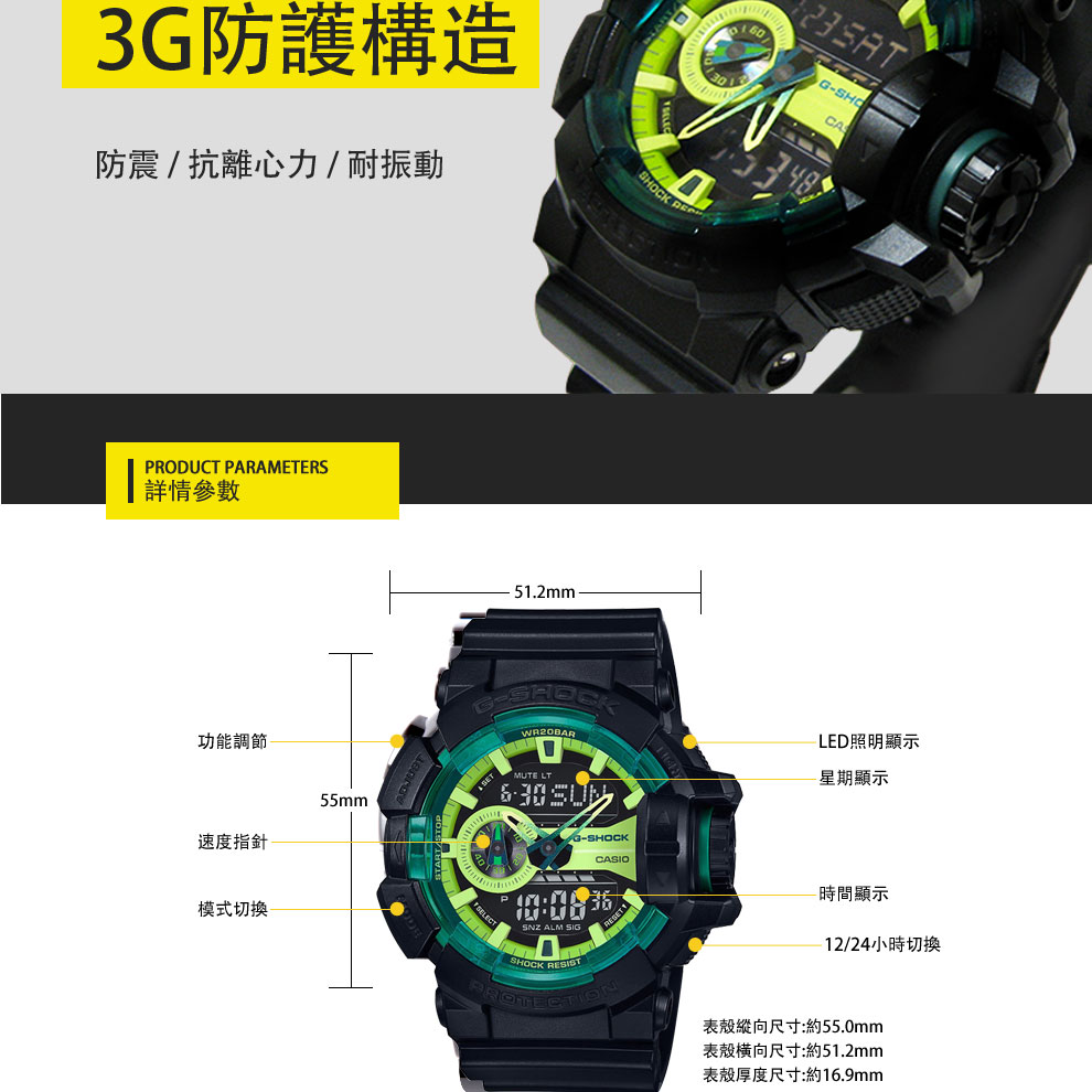 【EMS包邮】卡西欧/CASIO G-SHOCK硬碰硬联名黑色荧光黄防水运动GA-400LY-1AJF